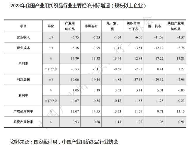 2023年以來,受地緣政治沖突加劇、全球通脹高企、全球產(chǎn)業(yè)鏈供應(yīng)鏈重塑等多重因素疊加影響,世界經(jīng)濟(jì)正呈現(xiàn)出“三高一低”(高核心通脹、高利率、高風(fēng)險(xiǎn)、低增長)的新特點(diǎn);我國面對世界經(jīng)濟(jì)復(fù)蘇乏力、國內(nèi)自然災(zāi)害頻發(fā)、改革發(fā)展穩(wěn)定任務(wù)艱巨等多重挑戰(zhàn),宏觀經(jīng)濟(jì)整體呈現(xiàn)波浪式發(fā)展、曲折式前進(jìn)的恢復(fù)過程。我國產(chǎn)業(yè)用紡織品行業(yè)仍處于2020年超常規(guī)增長后的恢復(fù)、調(diào)整期,主要產(chǎn)品生產(chǎn)保持了穩(wěn)步增長,但受部分重點(diǎn)子領(lǐng)域市場需求下滑、企業(yè)間競爭加劇的影響,行業(yè)的銷售、利潤、進(jìn)出口和投資都出現(xiàn)不同程度的下降。
