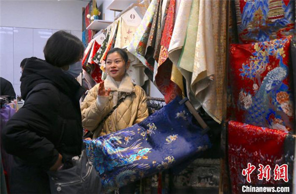今年3月,中國(guó)輕紡城商家給客戶介紹馬面裙面料