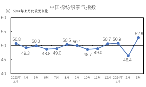 說明:中國棉紡織行業(yè)景氣指數(shù)采集自全國近500家次棉紡織廠,參考國家制造業(yè)PMI等指數(shù)制定方式,通過對多個(gè)主要指標(biāo)加權(quán)計(jì)算得出,當(dāng)指數(shù)高于50,表示棉紡織行業(yè)本月景氣程度好于上月,低于50則表示本月景氣程度不及上月。
