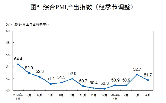 4月份,綜合PMI產(chǎn)出指數(shù)為51.7%,比上月下降1.0個(gè)百分點(diǎn),繼續(xù)高于臨界點(diǎn),表明我國(guó)企業(yè)生產(chǎn)經(jīng)營(yíng)活動(dòng)持續(xù)擴(kuò)張。