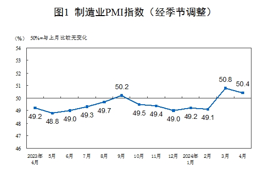 4月份,制造業(yè)采購經(jīng)理指數(shù)(PMI)為50.4%,比上月下降0.4個(gè)百分點(diǎn),連續(xù)兩個(gè)月位于擴(kuò)張區(qū)間,制造業(yè)繼續(xù)保持恢復(fù)發(fā)展態(tài)勢(shì)。