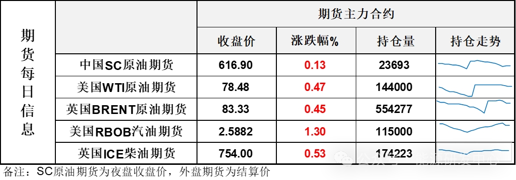 【1】WTI主力原油期貨收漲3.45美元,漲幅0.47%,報(bào)78.48美元/桶;布倫特主力原油期貨收漲0.37美元,漲幅0.45%,報(bào)83.33美元/桶;INE原油期貨收漲0.13%,報(bào)616.9元。