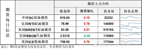 【1】WTI主力原油期貨收漲0.61美元,漲幅0.78%,報78.99美元/桶;布倫特主力原油期貨收漲0.42美元,漲幅0.51%,報83.58美元/桶;INE原油期貨收漲0.15%,報616元。