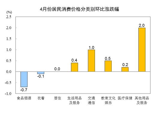 4月份,全國居民消費價格環(huán)比上漲0.1%。其中,城市上漲0.1%,農(nóng)村持平;食品價格下降1.0%,非食品價格上漲0.3%;消費品價格下降0.1%,服務(wù)價格上漲0.3%。