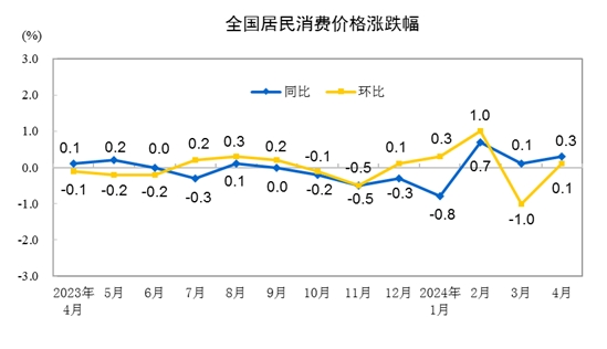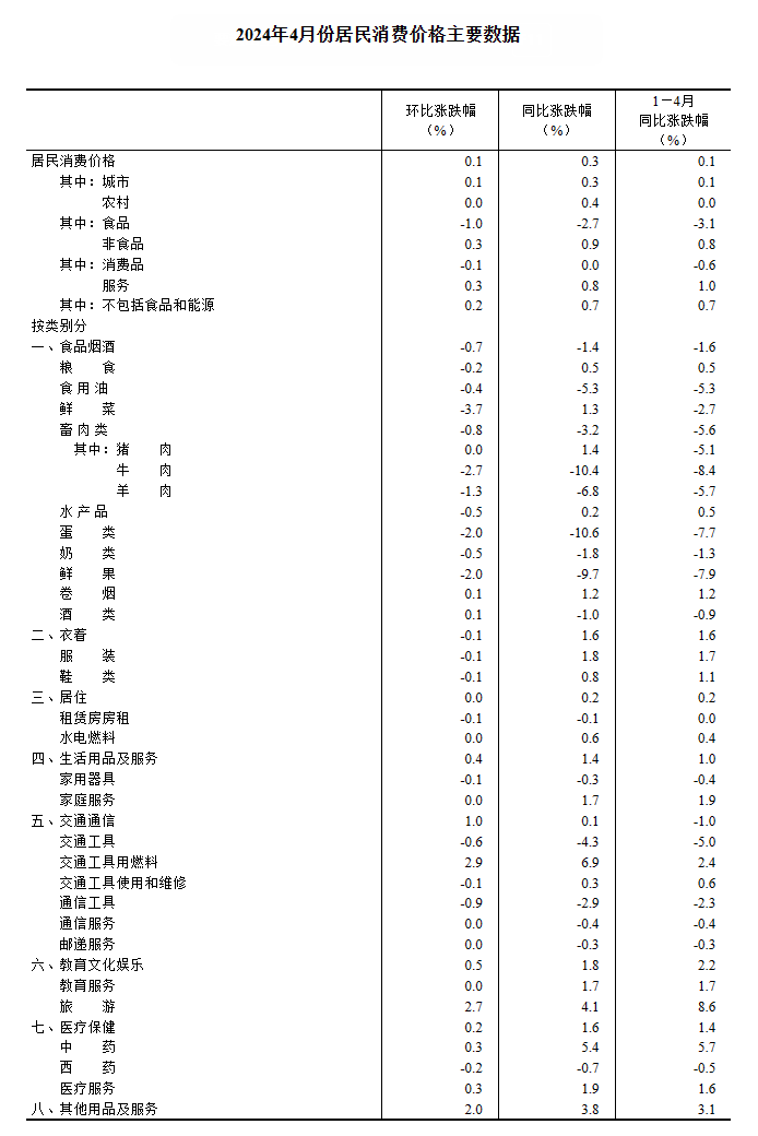 2024年4月份,全國居民消費價格同比上漲0.3%。其中,城市上漲0.3%,農(nóng)村上漲0.4%;食品價格下降2.7%,非食品價格上漲0.9%;消費品價格持平,服務(wù)價格上漲0.8%。1—4月平均,全國居民消費價格比上年同期上漲0.1%。