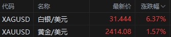 截至周五(5月17日)收盤,現(xiàn)貨黃金(577, 13.34, 2.37%)漲超1.5%報(bào)每盎司2414美元,逼近上個(gè)月創(chuàng)下的紀(jì)錄高位;現(xiàn)貨白銀(8211, 608.00, 8.00%)漲勢更猛,單日暴漲6.3%,最高報(bào)每盎司31.06美元,刷新近11年的新高。