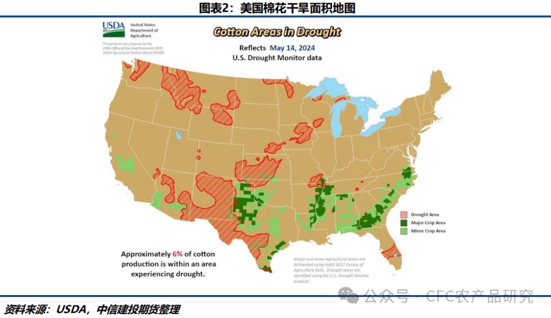 1、USDA周四發(fā)布的美國旱情監(jiān)測地圖顯示,截至5月14日僅約6%的美國棉花產區(qū)受到干旱影響,較此前一周的8%有所減輕,該數(shù)據(jù)處于歷史地位,對美棉生長較為有利。