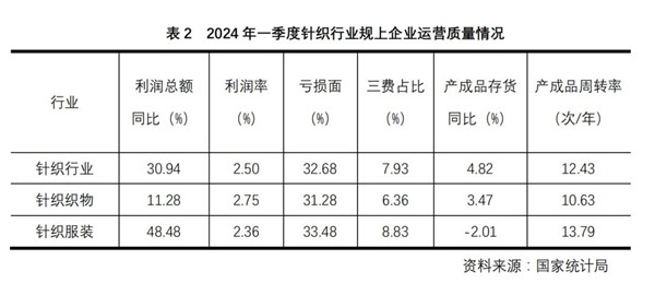 1~3月針織行業(yè)規(guī)模以上企業(yè)利潤總額同比大幅增長30.94%;虧損企業(yè)虧損額同比減少21.8%;行業(yè)虧損面較去年同期收窄0.78個百分點;每百元營業(yè)收入中的成本和三項費用占比較2023年同期均有所下降。