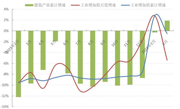 一季度,我國(guó)服裝行業(yè)有序復(fù)工復(fù)產(chǎn),在內(nèi)銷市場(chǎng)活力回升及出口小幅增長(zhǎng)的帶動(dòng)下,行業(yè)生產(chǎn)平穩(wěn)回升,規(guī)模以上企業(yè)工業(yè)增加值降幅較2023年有所收窄,服裝產(chǎn)量增速由降轉(zhuǎn)升。