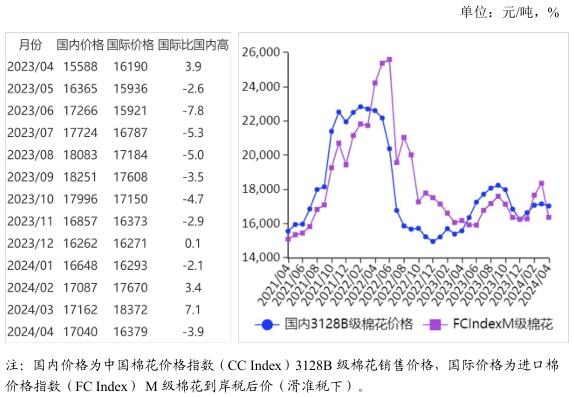(一)國內(nèi)棉價小幅下跌。本月,紡織市場“金三銀四”旺季不旺,疊加棉花原料庫存偏高,下游紡織廠購棉意愿下降,棉價小幅下跌。據(jù)《中國棉花工業(yè)庫存調(diào)查報告》數(shù)據(jù),4月初全國棉花工業(yè)庫存約77.2萬噸,環(huán)比增加3.2%,同比增加15.2%。采購意向調(diào)查顯示,4月初準(zhǔn)備采購棉花的企業(yè)占43.8%,環(huán)比減少2.4個百分點(diǎn),同比減少24.9個百分點(diǎn)。4月國內(nèi)3128B級棉花月均價每噸17040元,環(huán)比跌0.7%,同比漲9.3%。鄭棉期貨主力合約(CF409)月結(jié)算價每噸15695元,環(huán)比跌1.3%,同比漲2.7%。