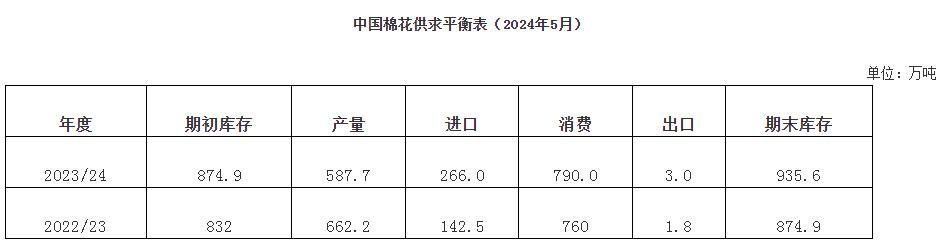 4月,國民經(jīng)濟(jì)運(yùn)行總體穩(wěn)定,延續(xù)回升向好態(tài)勢。國內(nèi)棉花市場供應(yīng)寬松,進(jìn)口量維持在高位,但略有回落;紡織市場旺季不旺特征較為明顯,需求平淡,棉價(jià)弱勢運(yùn)行;國際棉價(jià)受外圍因素影響跌幅較大,內(nèi)外棉價(jià)差由負(fù)回正。2024年棉花播種接近尾聲,部分地區(qū)農(nóng)作物由于多樣化種植,植棉面積有所下降。棉區(qū)氣象條件適宜播種,總體進(jìn)展順利,進(jìn)度快于去年,月底新疆大部棉花已出苗,早于常年。中國棉花協(xié)會預(yù)測2023/24年度,全國棉花產(chǎn)量587.7萬噸,同比下降11.3%;棉花進(jìn)口量266萬噸,同比增長86.7%;消費(fèi)量790萬噸,同比增長4%;期末庫存為935.6萬噸,同比增長6.9%。