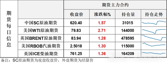 【1】WTI主力原油期貨收漲2.11美元,漲幅2.71%,報(bào)79.83美元/桶;布倫特主力原油期貨收漲1.06美元,漲幅1.28%,報(bào)83.94美元/桶;INE原油期貨收漲1.57%,報(bào)620.4元。