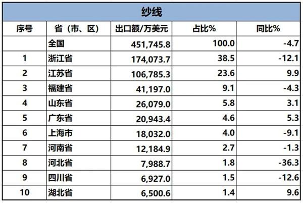 中國(guó)紡織品進(jìn)出口商會(huì)近日發(fā)布的相關(guān)分析報(bào)告顯示,從紡織服裝類重點(diǎn)商品出口前十名的省(區(qū)、市)來看,紗線出口方面,在浙江、福建等省份下滑的情況下,湖北紗線出口額穩(wěn)定增長(zhǎng)。2024年1-3月,湖北紗線出口額同比增長(zhǎng)8.8%;2024年1-4月,湖北省紗線出口額同比增長(zhǎng)9.6%。