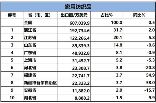 家用紡織品出口方面,湖北、新疆、福建快速增長(zhǎng)。2024年1-4月,新疆家用紡織品出口額同比增長(zhǎng)58%,躍居排名首位。