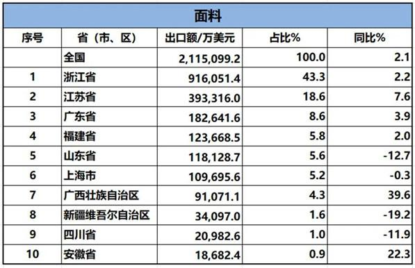 2024年1-4月,我國(guó)紡織品服裝累計(jì)出口898.44億美元,同比增長(zhǎng)0.3%。內(nèi)地31個(gè)省、自治區(qū)、直轄市紡織品服裝統(tǒng)計(jì)數(shù)據(jù)已出爐,浙江省、江蘇省、廣東省、山東省、福建省分別列全國(guó)紡織品服裝出口省市前五位,合計(jì)比重超七成。
