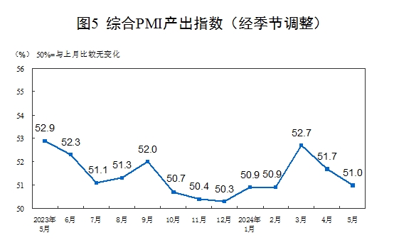 5月份,綜合PMI產(chǎn)出指數(shù)為51.0%,比上月下降0.7個百分點,繼續(xù)高于臨界點,表明我國企業(yè)生產(chǎn)經(jīng)營活動總體保持恢復(fù)發(fā)展態(tài)勢。