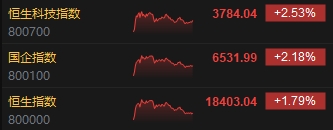 6月3日消息,港股三大指數(shù)集體高漲,截至收盤,恒生指數(shù)(18403.039, 323.43, 1.79%)漲1.79%,報(bào)18403.04點(diǎn),恒生科技指數(shù)(3784.04, 93.28, 2.53%)漲2.53%,國企指數(shù)漲2.18%。盤面上,科網(wǎng)股普遍上漲,騰訊漲超4%,美團(tuán)漲超3%,京東、小米、阿里、網(wǎng)易漲超2%;汽車股全天強(qiáng)勢,廣汽集團(tuán)(3.35, 0.21, 6.69%)漲超6%,理想、比亞迪漲超5%;蘋果概念股漲幅居前,比亞迪電子(36.25, 2.45, 7.25%)漲超7%;醫(yī)藥外包概念股逆勢下跌,金斯瑞生物科技(8.23, -1.77, -17.70%)跌超17%。