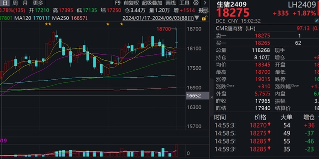 在期市大片走弱的環(huán)境下,生豬期貨一枝獨秀,6月3日一度收獲超2%漲幅。消息面上,隨著端午節(jié)臨近,近期生豬市場價格持續(xù)大幅走強。加之經(jīng)歷前期持續(xù)虧損,當前生豬養(yǎng)殖端整體步入盈利區(qū)間,周期反轉(zhuǎn)預(yù)期確立,生豬期貨近期持續(xù)震蕩走強。