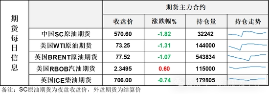【1】WTI主力原油期貨收跌0.97美元,跌幅1.31%,報73.25美元/桶;布倫特主力原油期貨收跌0.84美元,跌幅1.07%,報77.52美元/桶;INE原油期貨收跌1.82%,報570.6元。