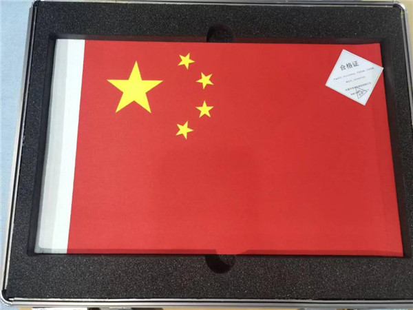 針對上述三大技術難點,月面國旗研制團隊聯合湖北匯爾杰玄武巖纖維有限公司創(chuàng)新設計了噴絲板內腔結構,并進行了梯形優(yōu)化,再配合爐內分布式精準控溫,成功實現了超細玄武巖纖維的穩(wěn)定量產;團隊在理論設計的基礎上,結合華茂集團在紡紗領域創(chuàng)新實踐優(yōu)勢,利用柔性水溶性長絲和芳綸短纖分層防護,巧妙設計了“雙防護罩”結構,有效保護玄武巖長絲的同時還解決了玄武巖纖維高模量導致“起小辮子”的行業(yè)難題;光滑的玄武巖長絲對制作月面國旗又提出新的挑戰(zhàn),團隊利用織物表面的芳綸短纖毛羽,使顏料中的粘合劑與其形成類似“鉚釘”錨定的效果,有效提升涂料的界面結合牢度與國旗圖案的飽滿度,保障國旗的月面展示效果。通過以上技術攻關,首次成功研制出能耐受高真空、高低溫循環(huán)、強劑量紫外輻照等極端環(huán)境條件的“石頭版”高品質織物國旗。