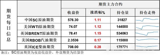【1】WTI主力原油期貨收漲0.82美元,漲幅1.12%,報(bào)74.07美元/桶;布倫特主力原油期貨收漲0.89美元,漲幅1.15%,報(bào)78.41美元/桶;INE原油期貨收漲1.11%,報(bào)576.3元。