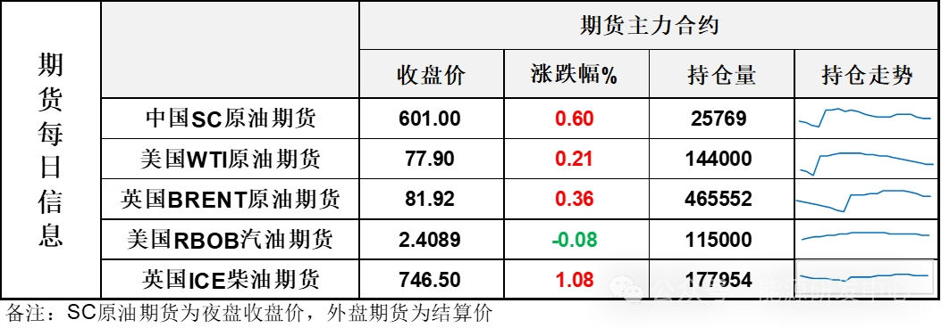 【1】WTI主力原油期貨收漲2.37美元,漲幅0.21%,報77.9美元/桶;布倫特主力原油期貨收漲0.29美元,漲幅0.36%,報81.92美元/桶;INE原油期貨收漲0.6%,報601元。