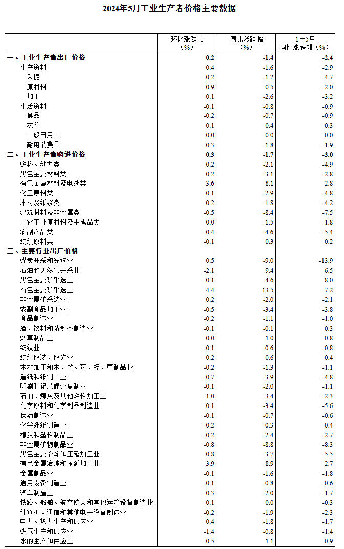 2024年5月份,全國工業(yè)生產(chǎn)者出廠價格同比下降1.4%,降幅比上月收窄1.1個百分點,環(huán)比上漲0.2%,上月為下降0.2%;工業(yè)生產(chǎn)者購進(jìn)價格同比下降1.7%,環(huán)比上漲0.3%。1—5月平均,工業(yè)生產(chǎn)者出廠價格比上年同期下降2.4%,工業(yè)生產(chǎn)者購進(jìn)價格下降3.0%。