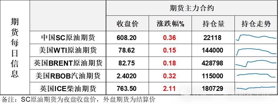 【1】WTI主力原油期貨收漲0.12美元,漲幅0.15%,報(bào)78.62美元/桶;布倫特主力原油期貨收漲0.15美元,漲幅0.18%,報(bào)82.75美元/桶;INE原油期貨收漲0.36%,報(bào)608.2元。