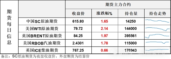 【1】WTI主力原油期貨收漲1.67美元,漲幅2.14%,報79.72美元/桶;布倫特主力原油期貨收漲1.63美元,漲幅1.97%,報84.25美元/桶;INE原油期貨收漲1.65%,報615.8元。