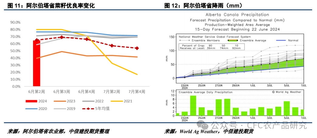目前加菜籽主產(chǎn)區(qū)播種已經(jīng)基本結(jié)束,市場關(guān)注點轉(zhuǎn)向優(yōu)良率及天氣變化。從阿爾伯塔省歷年菜籽優(yōu)良率的變化趨勢來看,7月發(fā)布的優(yōu)良率報告整體呈現(xiàn)下降趨勢,但下降幅度受制于當時的天氣表現(xiàn)。近期阿爾伯塔省降雨持續(xù)偏多,使得短期內(nèi)優(yōu)良率下調(diào)概率較低。