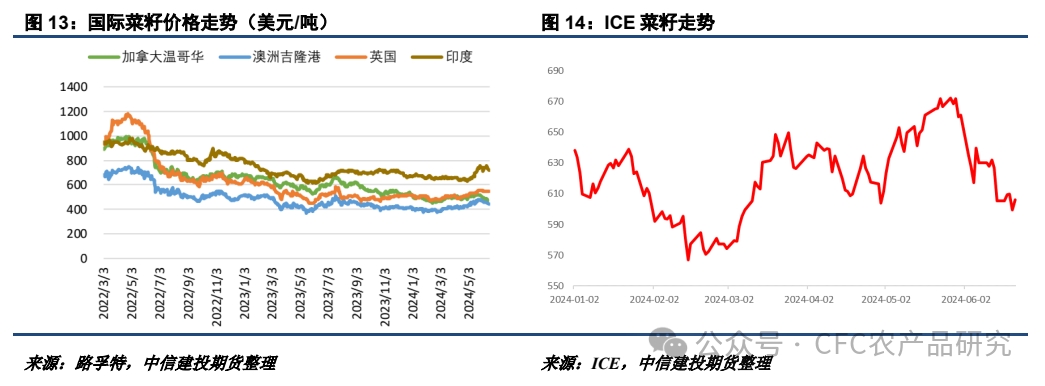 近期國際菜籽整體有所回落。除了印度菜籽價格保持相對堅挺外,加拿大和澳洲的菜籽報價均走弱,拖累了ICE菜籽和EURONEXT菜籽期貨合約的表現(xiàn)。短期來看預(yù)計國際菜籽價格表現(xiàn)仍將保持弱勢運行,但需要關(guān)注歐洲菜籽的實際減產(chǎn)幅度表現(xiàn)。