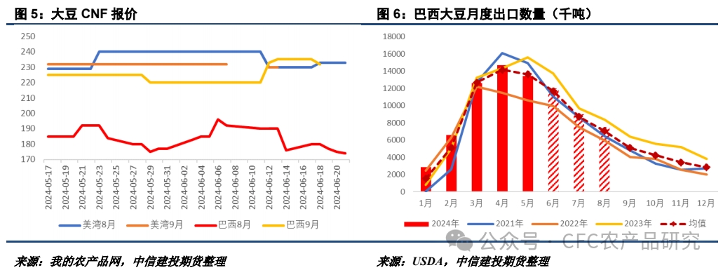 本周巴豆CNF報價有一定下調(diào),對美豆存在性價比,后期可關(guān)注巴西雷亞爾匯率波動的潛在影響。6 月以來巴西各港口對中國已發(fā)船總量為547.1萬噸,環(huán)比增加321.3萬噸。整體來看本年度巴西出口報價較為堅挺,倉儲端逼迫農(nóng)戶降價的壓力有所下降。