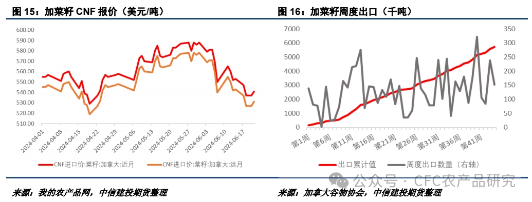本周加菜籽CNF報價維持震蕩,國內(nèi)買船積極性暫時下降,目前6-10月份菜籽買船基本充足。加菜籽累計出口數(shù)量已超過570萬噸,預(yù)計能夠完成600萬噸的出口目標,但整體結(jié)轉(zhuǎn)庫存增加趨勢已經(jīng)在所難免。
