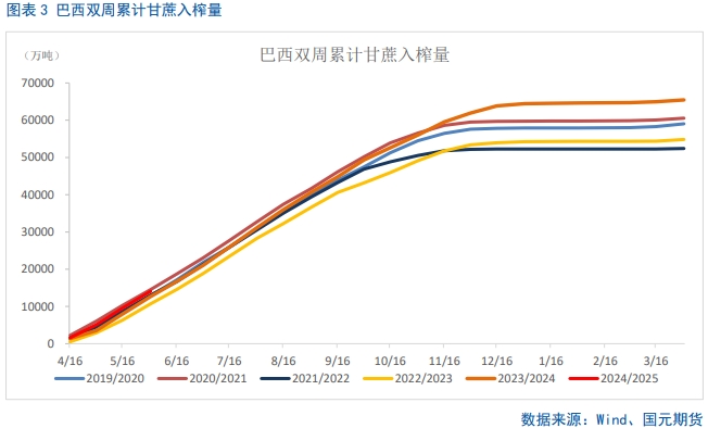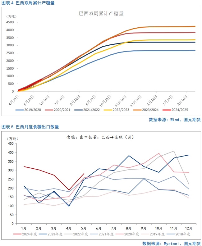 5月巴西甘蔗壓榨與食糖生產(chǎn)均不及市場(chǎng)預(yù)期巴西甘蔗行業(yè)組織UNICA公布的數(shù)據(jù)顯示,5月上半月巴西中南部地區(qū)甘蔗壓榨量總計(jì)為4,475萬(wàn)噸,較去年同期增長(zhǎng)0.43%,略低于市場(chǎng)預(yù)期。UNICA在報(bào)告中稱(chēng),5月上半月糖產(chǎn)量為257萬(wàn)噸,較去年同期增長(zhǎng)0.97%,乙醇產(chǎn)量增長(zhǎng)2.14%,至19.9億公升。5月下半月巴西中南部地區(qū)糖產(chǎn)量亦低于預(yù)期,用于榨糖的甘蔗數(shù)量連續(xù)第二次低于分析師的預(yù)期。UNICA發(fā)布報(bào)告稱(chēng),5月下半月糖產(chǎn)量為270萬(wàn)噸,同比下降7.72%;甘蔗壓榨總量為4520萬(wàn)噸,同比下降3.36%;乙醇產(chǎn)量小幅下降0.2%,至21.2億公升。但從5月份巴西產(chǎn)糖量不及市場(chǎng)預(yù)期這單一因素上不足以推翻2024/25榨季巴西繼續(xù)豐產(chǎn)的定調(diào),雖然目前有部分國(guó)外機(jī)構(gòu)將巴西2024/25榨季產(chǎn)糖量預(yù)估值下修了80萬(wàn)噸,但只要巴西新榨季產(chǎn)糖量維持在4000萬(wàn)噸以上,就是有史以來(lái)的次高位產(chǎn)糖量。