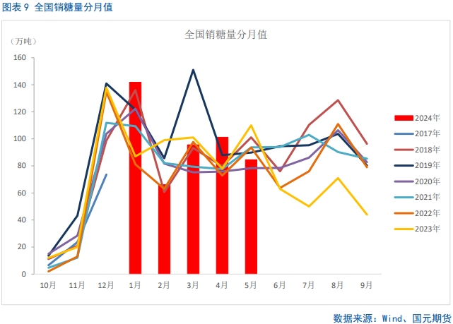 截至5月底,2023/24榨季食糖生產(chǎn)已全部結(jié)束:全國(guó)共生產(chǎn)食糖996.32萬(wàn)噸,同比增加99萬(wàn)噸,增幅11.03%。其中,甘蔗糖882.42萬(wàn)噸,甜菜糖113.9萬(wàn)噸;全國(guó)累計(jì)銷(xiāo)售食糖659.28萬(wàn)噸,同比增加34.12萬(wàn)噸,增幅5.46%;累計(jì)銷(xiāo)糖率66.17%,同比放緩3.49個(gè)百分點(diǎn)。全國(guó)食糖工業(yè)庫(kù)存337.04萬(wàn)噸,處于近7個(gè)榨季的次低水平;我國(guó)近3個(gè)月白糖進(jìn)口量極度偏低,據(jù)海關(guān)總署6月18日公布的數(shù)據(jù)顯示,我國(guó)5月食糖進(jìn)口量2萬(wàn)噸,同比減少51.8%。