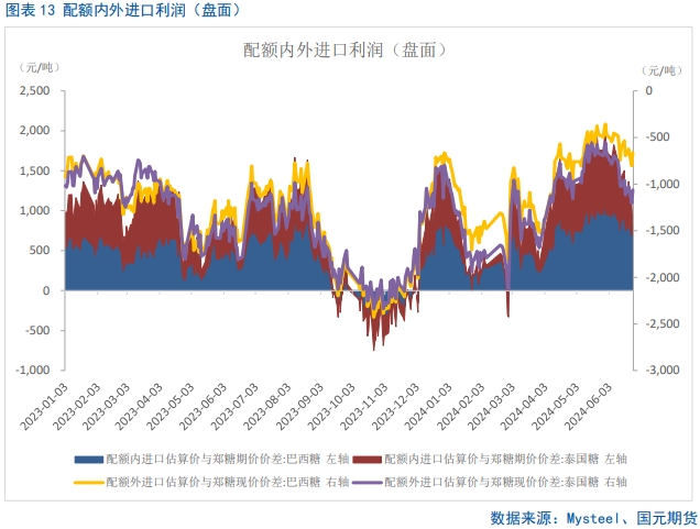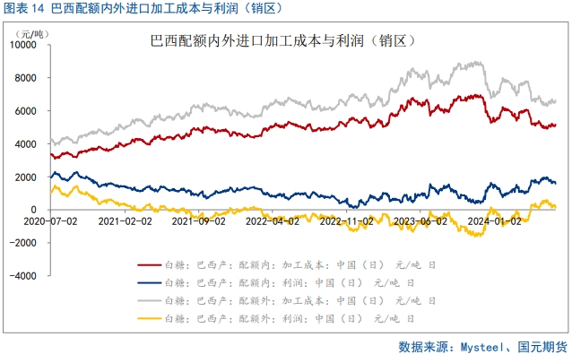 2024年 3-5月,我國(guó)食糖進(jìn)口量嚴(yán)重低于去年同期水平,考慮到2個(gè)月的船期,3-5月的買(mǎi)船到港正值巴西糖配額外利潤(rùn)為負(fù)時(shí)的時(shí)間窗口;雖然2024年4月原糖大跌之后,內(nèi)外價(jià)差縮窄,巴西糖配額外進(jìn)口利潤(rùn)打開(kāi)且轉(zhuǎn)正,高于 2023 年與 2022 年同期時(shí)的配額外進(jìn)口利潤(rùn)區(qū)間,但是當(dāng)前進(jìn)口糖供應(yīng)壓力還未顯現(xiàn),預(yù)計(jì)4-5月加工糖廠點(diǎn)價(jià)后的買(mǎi)船到港時(shí)間將為三季度。