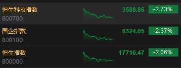 6月27日消息,港股三大指數(shù)低開低走,截至收盤,恒生指數(shù)(17716.471, -373.46, -2.06%)跌2.06%,報17716.47點,恒生科技指數(shù)(3588.86, -100.82, -2.73%)跌2.73%,國企指數(shù)跌2.37%。盤面上,科網(wǎng)股普遍下挫,小米集團全天重挫逾7%,美團跌近3%,京東跌超2%,騰訊、阿里巴巴、聯(lián)想跌近2%;煤炭股跌幅居前,中國神華(35.15, -2.06, -5.53%)跌超5%;家電股全天低迷,海信家電(28.15, -3.25, -10.35%)跌超10%;醫(yī)藥股齊挫,微創(chuàng)機器人跌超18%;電訊服務(wù)板塊逆勢高漲,中國電信(4.65, 0.13, 2.88%)漲近3%。