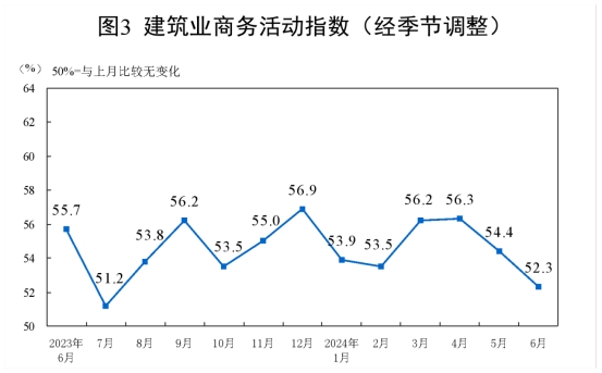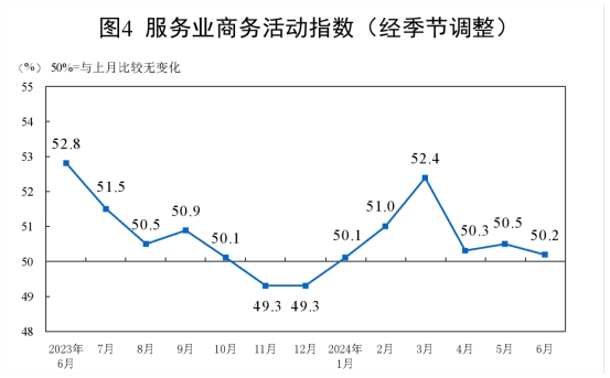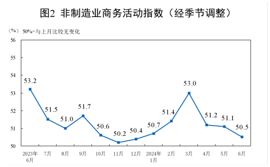 6月份,非制造業(yè)商務(wù)活動(dòng)指數(shù)為50.5%,比上月下降0.6個(gè)百分點(diǎn),高于臨界點(diǎn),非制造業(yè)繼續(xù)保持?jǐn)U張。