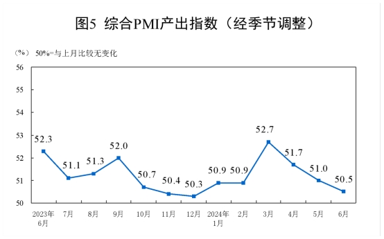 6月份,綜合PMI產(chǎn)出指數(shù)為50.5%,比上月下降0.5個(gè)百分點(diǎn),高于臨界點(diǎn),表明我國企業(yè)生產(chǎn)經(jīng)營活動(dòng)總體繼續(xù)保持?jǐn)U張。