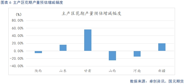據(jù)卓創(chuàng)資訊對(duì)坐果期套袋調(diào)研,新季各產(chǎn)區(qū)有增有減。整體來看,2024年預(yù)估產(chǎn)量3871萬噸,較2023年3557萬噸的產(chǎn)量,增產(chǎn)8.98%。今年花期,氣候條件良好,果面質(zhì)量和果個(gè)較去年均有上升,后續(xù)仍需關(guān)注生長(zhǎng)期天氣狀況,如未遭遇干旱、冰雹等自然災(zāi)害的影響,實(shí)際產(chǎn)量會(huì)比預(yù)估進(jìn)一步上調(diào)。