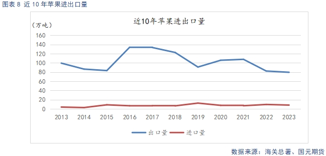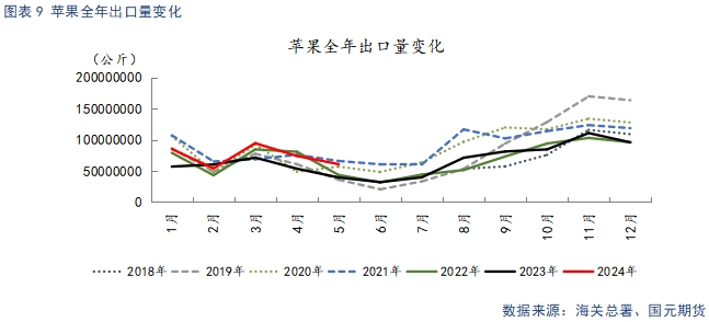 據(jù)海關(guān)總署數(shù)據(jù)顯示,24年1-5月,我國(guó)蘋果累計(jì)出口量為36.8萬噸,較去年同比上漲30.96%。同比增幅明顯,在歷年出口數(shù)據(jù)中處于較高水平。主要是適合出口的貨源價(jià)格持續(xù)走弱,成本優(yōu)勢(shì)明顯。今年以來,我國(guó)蘋果出口數(shù)據(jù)表現(xiàn)亮眼,不過我國(guó)每年出口量占總產(chǎn)能的比例在2-3%左右,鮮果消費(fèi)主要還是依靠?jī)?nèi)需,在內(nèi)需低迷的大背景下,外貿(mào)向好對(duì)蘋果支撐力度有限。