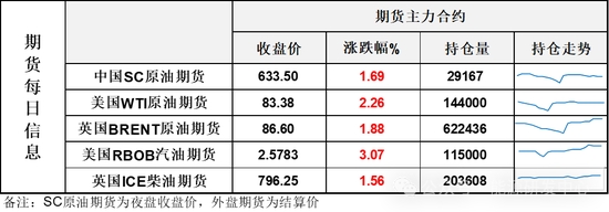【1】WTI主力原油期貨收漲1.84美元,漲幅2.26%,報83.38美元/桶;布倫特主力原油期貨收漲1.6美元,漲幅1.88%,報86.6美元/桶;INE原油期貨收漲1.69%,報633.5元。