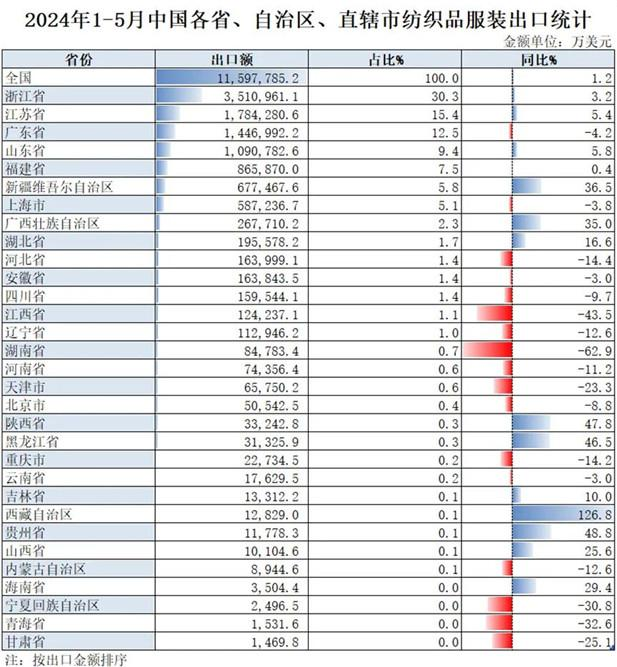 2024年1-5月我國(guó)紡織服裝重點(diǎn)省市出口概況