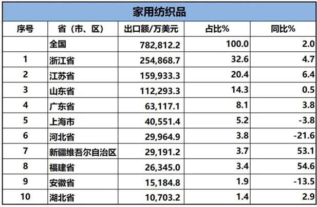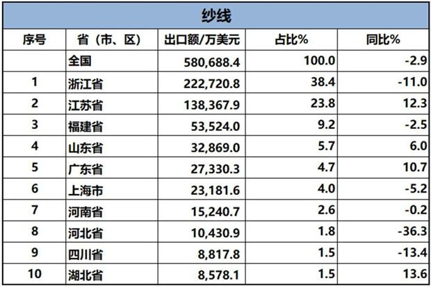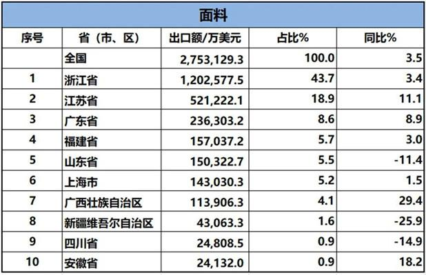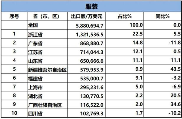 2024年1-5月,我國(guó)紡織服裝累計(jì)出口1159.78億美元,同比增長(zhǎng)1.2%。內(nèi)地31個(gè)省、自治區(qū)、直轄市紡織服裝統(tǒng)計(jì)數(shù)據(jù)已出爐,浙江省、江蘇省、廣東省、山東省、福建省分別列全國(guó)紡織服裝出口省市前五位,合計(jì)比重超七成。