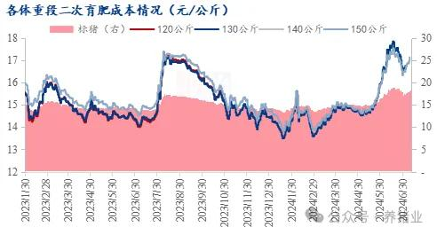 2024年上半年,二育大致分為兩波。第一批在今年的3月初-4月中旬,由于毛豬價格位于低位,二育進場成本較低,疊加供應(yīng)縮減市場看漲情緒一度被點燃。據(jù)Mysteel農(nóng)產(chǎn)品數(shù)據(jù)監(jiān)測顯示3月初-4月中旬入100公斤二次育肥,養(yǎng)至120公斤,平均成本在14.73元/公斤;養(yǎng)至130公斤,平均成本在14.61元/公斤;養(yǎng)至140公斤,平均成本在14.61元/公斤;養(yǎng)至150公斤,平均成本在14.74元/公斤。