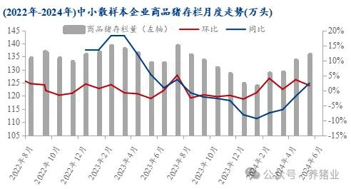 進入6月規(guī)模場商品豬存欄量為3384.09萬頭,環(huán)比上漲0.41%,同比減少0.41%。85家中小散樣本企業(yè)6月份存欄量為135.71萬頭,環(huán)比上漲1.59%,同比上漲2.35%。2023年7月仍有慣性投苗補欄,對應(yīng)2024年6月生豬供給增加,且5月份看漲預(yù)期下,養(yǎng)殖端有壓欄操作,出欄節(jié)奏減緩,亦不乏散養(yǎng)戶二育及仔豬和母豬投苗,故商品豬存欄量環(huán)比增量。隨著一季度仔豬及其母豬的補欄產(chǎn)能兌現(xiàn),預(yù)計三四季度商品豬存欄量是微增趨勢。
