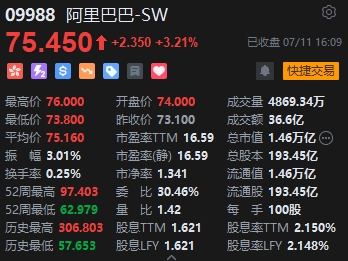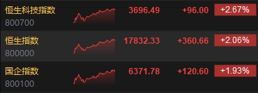 7月11日消息,港股三大指數(shù)高開高走,截至收盤,恒生指數(shù)(17832.33, 360.66, 2.06%)漲2.06%,報(bào)17832.33點(diǎn),恒生科技指數(shù)(3696.49, 96.00, 2.67%)漲2.67%,國企指數(shù)漲1.93%。盤面上,科網(wǎng)股齊漲,馬云現(xiàn)身阿里巴巴漲超3%,京東漲近3%,百度漲超2%,騰訊漲近2%;汽車經(jīng)銷商板塊漲幅居前,中升控股(12.56, 0.74, 6.26%)漲超6%,汽車股亦漲勢(shì)強(qiáng)勁,小鵬漲超11%;蘋果概念股集體走強(qiáng),丘鈦科技(4.99, 0.97, 24.13%)發(fā)盈喜大漲逾24%;“鋰電雙雄”集體沖高,贛鋒鋰業(yè)(17.16, 1.40, 8.88%)漲近9%。