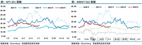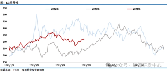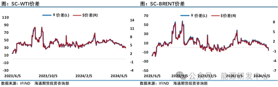 2024年上半年油價(jià)重心上移明顯,雖然在5月份油價(jià)一度大幅回撤,但隨著6月份市場(chǎng)預(yù)期好轉(zhuǎn)推動(dòng)油價(jià)再次反彈反彈,最終上半年歐美市場(chǎng)油價(jià)漲幅10%左右,國(guó)內(nèi)SC原油(618, -2.20, -0.35%)在人民幣匯率下行等因素影響下上半年累積漲幅比歐美市場(chǎng)略高。不過值得注意的是SC的強(qiáng)勢(shì)更多體現(xiàn)在一季度上周上漲階段,5月之后隨著國(guó)內(nèi)越來越多的跡象顯示國(guó)內(nèi)成品油需求遠(yuǎn)低于年初預(yù)期,這開始拖累SC原油的表現(xiàn),SC開始明顯弱于歐美市場(chǎng),跨區(qū)價(jià)差走弱3美元左右,從這一點(diǎn)可以看出SC運(yùn)行越來越成熟,越來越能客觀反映中國(guó)市場(chǎng)供需狀況。總體來看今年上半年油價(jià)表現(xiàn)強(qiáng)于去年同期,而且油價(jià)運(yùn)行大節(jié)奏基本一致,都是春季走出反彈行情,并在4月份出現(xiàn)高點(diǎn),之后5月有一輪明顯回調(diào),在6月重新止跌回暖。