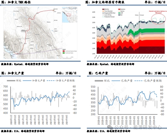 除了OPEC+和美國(guó),今年原油產(chǎn)量的增長(zhǎng)主要來自于加拿大、圭亞那和巴西(巴西以“觀察員”身份加入OPEC+,并不執(zhí)行減產(chǎn)政策)。加拿大最受關(guān)注的是TMX擴(kuò)建管道在5月份投產(chǎn),理論上可以使輸送能力從30萬桶/日增長(zhǎng)到89萬桶/日,有助于油砂產(chǎn)能釋放。加拿大6月產(chǎn)量為590萬桶/日,較4、5月份產(chǎn)量環(huán)比回升。下半年,加拿大油田擴(kuò)產(chǎn)配合TMX管道加大輸送,預(yù)計(jì)產(chǎn)量會(huì)有30萬桶的提升。