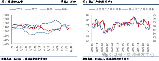 下沉至原油市場(chǎng),中國(guó)石油需求的增長(zhǎng)與國(guó)內(nèi)生產(chǎn)總值的增長(zhǎng)密切相關(guān)。在國(guó)內(nèi)內(nèi)需較弱的背景下,我們觀察到主營(yíng)煉廠開工率處于平均水平,但獨(dú)立煉廠的開工率偏低,導(dǎo)致原油加工量在上半年同比下滑。主要由于地?zé)拰?duì)利潤(rùn)的敏感度更高,在低利潤(rùn)的背景下開工難有起色。分產(chǎn)品來看,上半年汽油消費(fèi)同比增長(zhǎng)0.21%,基本符合市場(chǎng)預(yù)期。然而,隨著新能源汽車的增長(zhǎng),汽油后期增量有限。而柴油需求有小幅回落,同比下降3.8%。今年物流領(lǐng)域柴油消費(fèi)的下滑意味著柴油或進(jìn)出全領(lǐng)域需求趨弱階段。